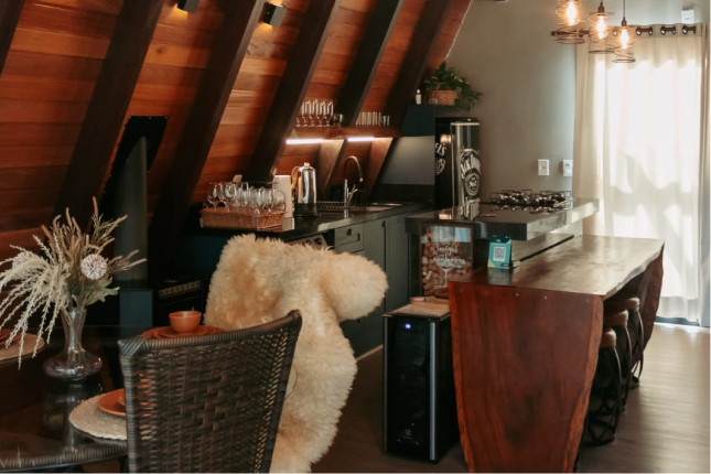 Com decoração aconchegante, varanda com deck e espaço externo com fire pit e trempe campeiro, é o cenário perfeito para momentos inesquecíveis a dois.
