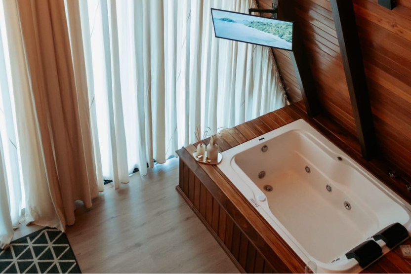 Com aquecimento a gás, hidromassagem e cromoterapia, com vista para a natureza.