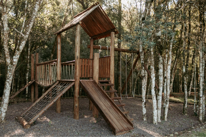 Trilhas, cachoeiras, muito contato com a natureza ao redor e Playground Infantil para as crianças se divertirem.